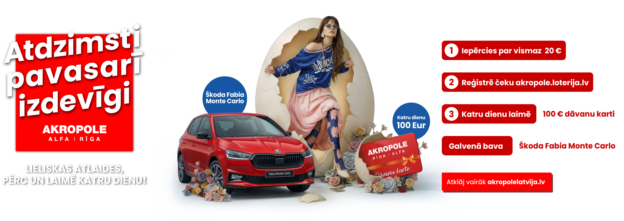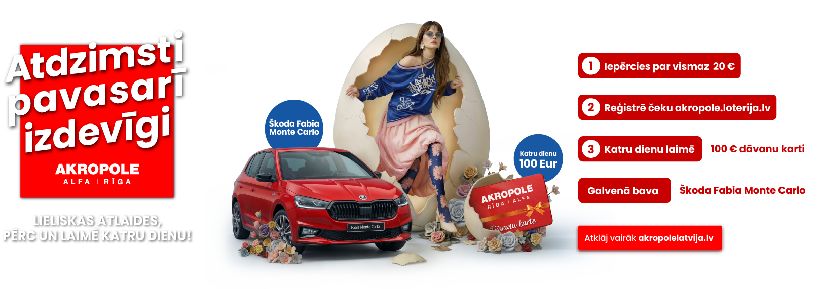 3. Loterijas norises teritorija: Iepirkšanās un izklaides centrs “AKROPOLE Rīga”, Latgales ielā 257, Rīgā, LV-1063 un Iepirkšanās un Izklaides centrs “AKROPOLE Alfa”, Brīvības gatve 372, Rīga, Latvija, LV-1006, turpmāk – I/C “AKROPOLE”. Loterijā var piedalīties ikviens Latvijas Republikas iedzīvotājs.